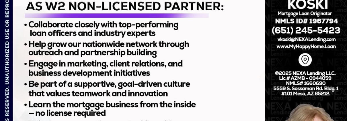 Hi, my name is Valerie Koski. I’m a Loan Officer with NEXA Mortgage LLC., offering personalized mortgage solutions, fast customized quotes, great rates and service with integrity.