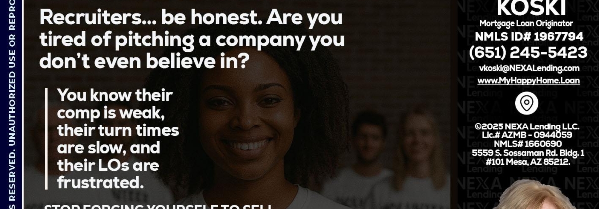 Hi, my name is Valerie Koski. I’m a Loan Officer with NEXA Mortgage LLC., offering personalized mortgage solutions, fast customized quotes, great rates and service with integrity.